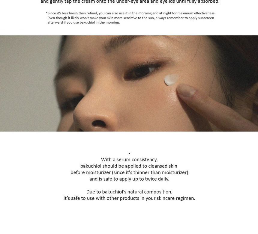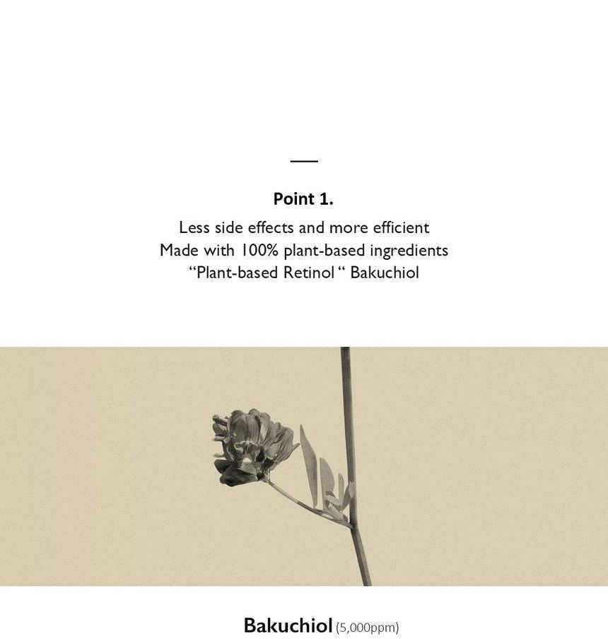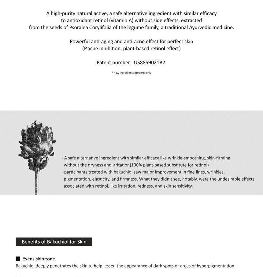 Bakuchiol: un ingrediente activo natural de alta pureza, un ingrediente alternativo seguro con una eficacia similar al retinol antioxidante (vitamina A) sin efectos secundarios, extraído de las semillas de Psoralea Corylifolia de la familia de las leguminosas, una medicina ayurvédica tradicional.