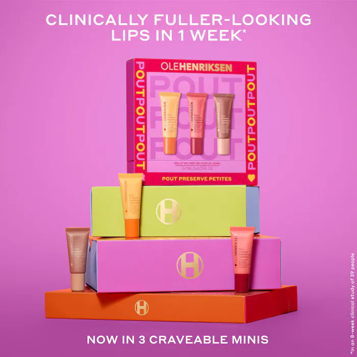 Un mini trío de edición limitada de los tratamientos labiales Pout Preserve Peptide más vendidos que rellenan rápidamente los labios con hidratación para unos labios de aspecto más voluminoso.