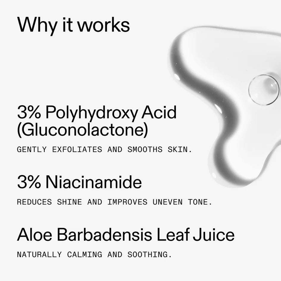 Diseñado para revitalizar la piel apagada, seca y congestionada, este protector solar utiliza polihidroxiácidos para exfoliar suavemente las células muertas y limpiar los poros obstruidos. Está potenciado por las propiedades humectantes naturales de los PHA, que favorecen la capacidad de la piel para mantener la hidratación. Además, combinado con el suave jugo de hoja de aloe barbadensis para mantener la piel nutrida y niacinamida para mejorar la textura general, este tónico ligero se convertirá en un básico en tu rutina
