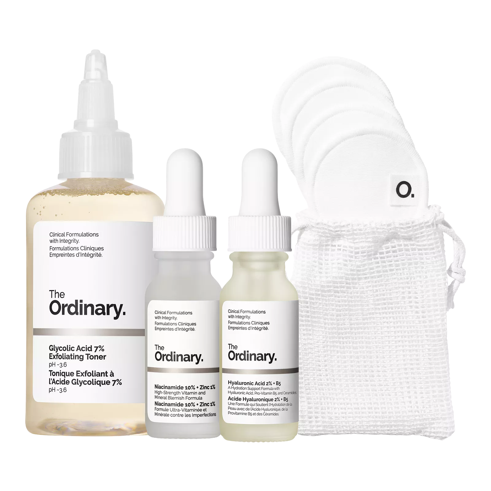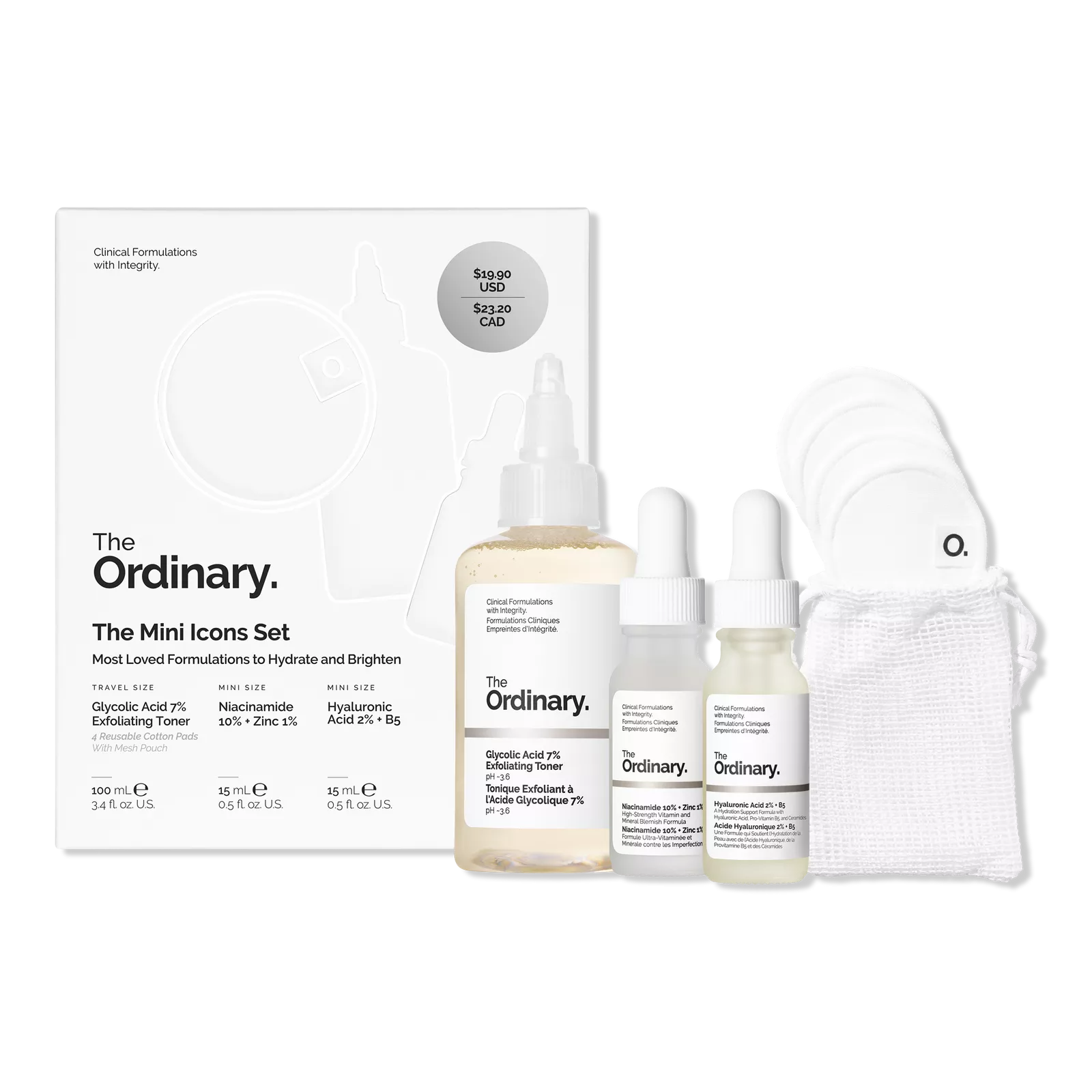 El set Mini Icons incluye tres tamaños en miniatura de algunas de nuestras formulaciones más queridas, ideales para viajar. El conjunto también incluye almohadillas de algodón reutilizables de cortesía de The Ordinary para apoyar la aplicación de tónico exfoliante con ácido glicólico al 7%.